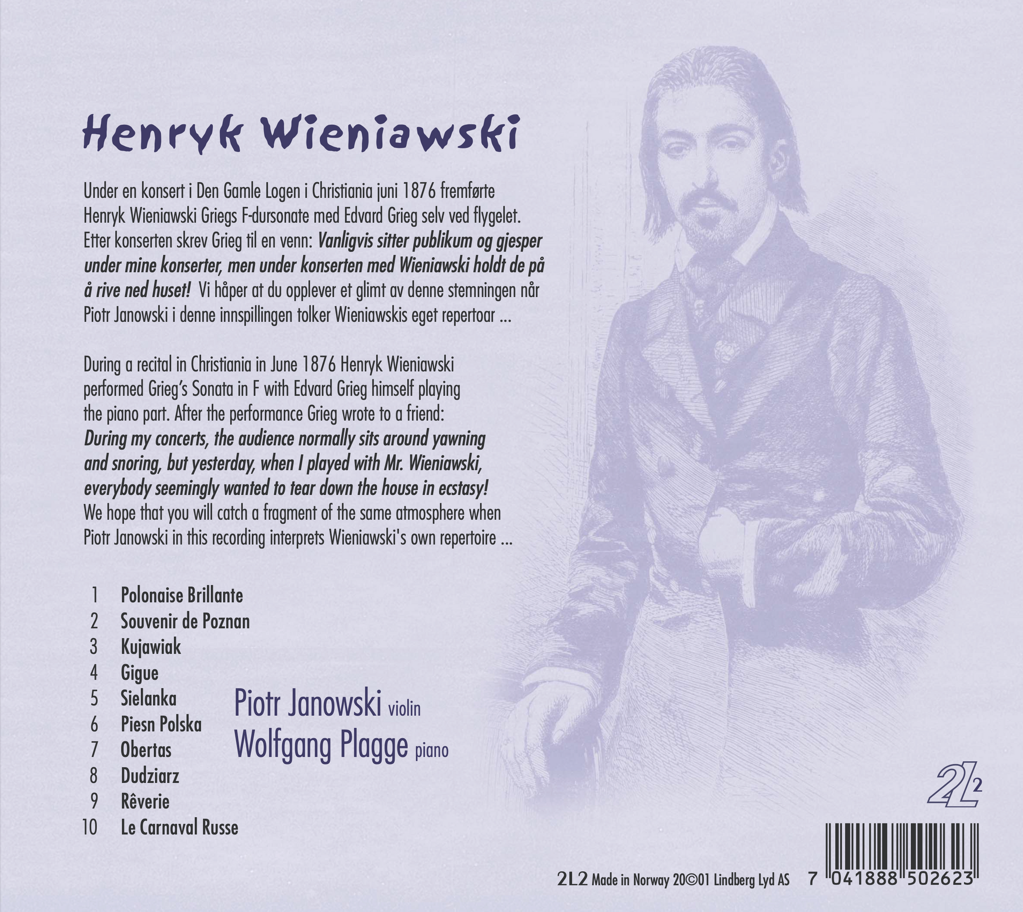 Under en konsert i Den Gamle Logen i Christiania juni 1876 fremførte Henryk Wieniawski Griegs F-dursonate med Edvard Grieg selv ved flygelet. Etter konserten skrev Grieg til en venn: Vanligvis sitter publikum og gjesper under mine konserter, men under konserten med Wieniawski holdt de på å rive ned huset! Vi håper at du opplever et glimt av denne stemningen når Piotr Janowski i denne innspillingen tolker Wieniawskis eget repertoar ...