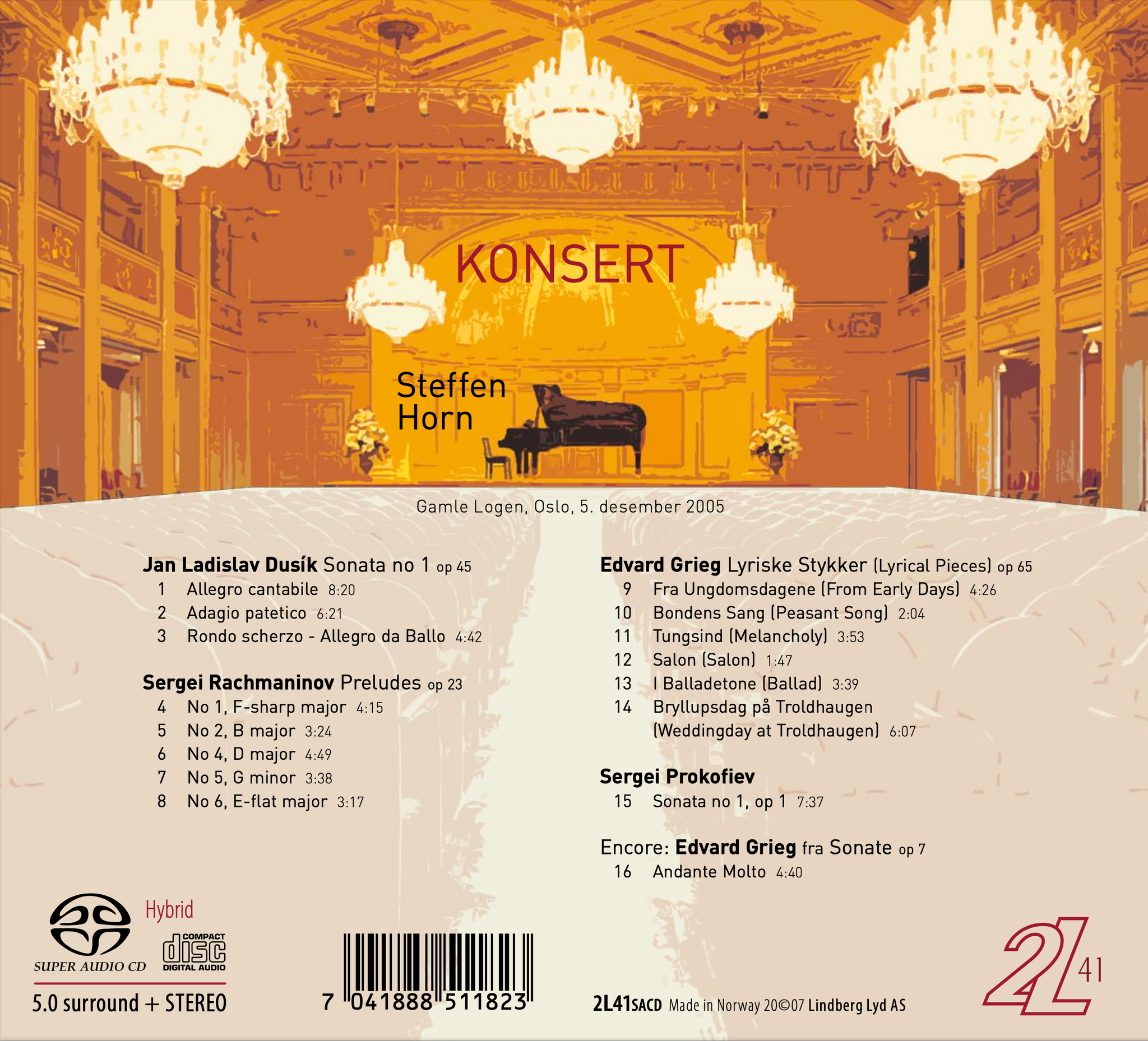This CD recording was made during my Norwegian tour, 2005, and represents my most personal repertoire programme to date. It has been a great pleasure, and very refreshing, to get the opportunity to put together a repertoire of music which simply means a great deal to me, and which I was extremely eager to perform on stage. The Czech Republic, Norway and Russia form a European triangle. Each country displays its own unique style, but they have one thing in common: a heavy folkloristic influence, especially during the romantic era. Besides the fact that I am half Czech, this may well be what attracts me so strongly to the music of these three countries. I find their music highly expressive and heartfelt. Music by Jan Ladislav Dusík, Sergei Rachmaninov, Edvard Grieg and Sergei Prokofiev.