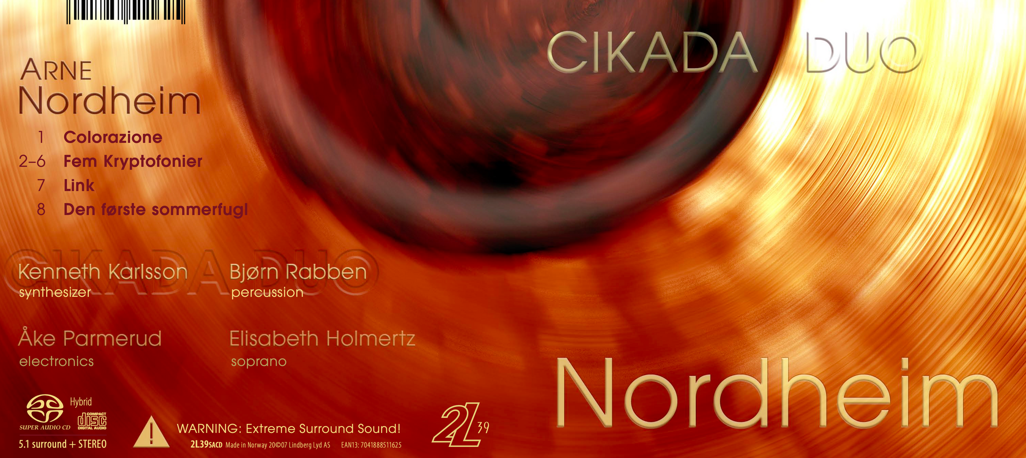 CIKADA DUO is Kenneth Karlsson (piano/synthesizer) and Bjørn Rabben (percussion). They are joined by Åke Parmerud (elektronics) and Elisabeth Holmertz (soprano) in this production of Arne Nordheim's music. Take the stand within the percussion and let yourself be embraced by electronica, vocal and synthesizers in an extreme surround sound recording, produced by the GRAMMY-nominated Lindberg Lyd.