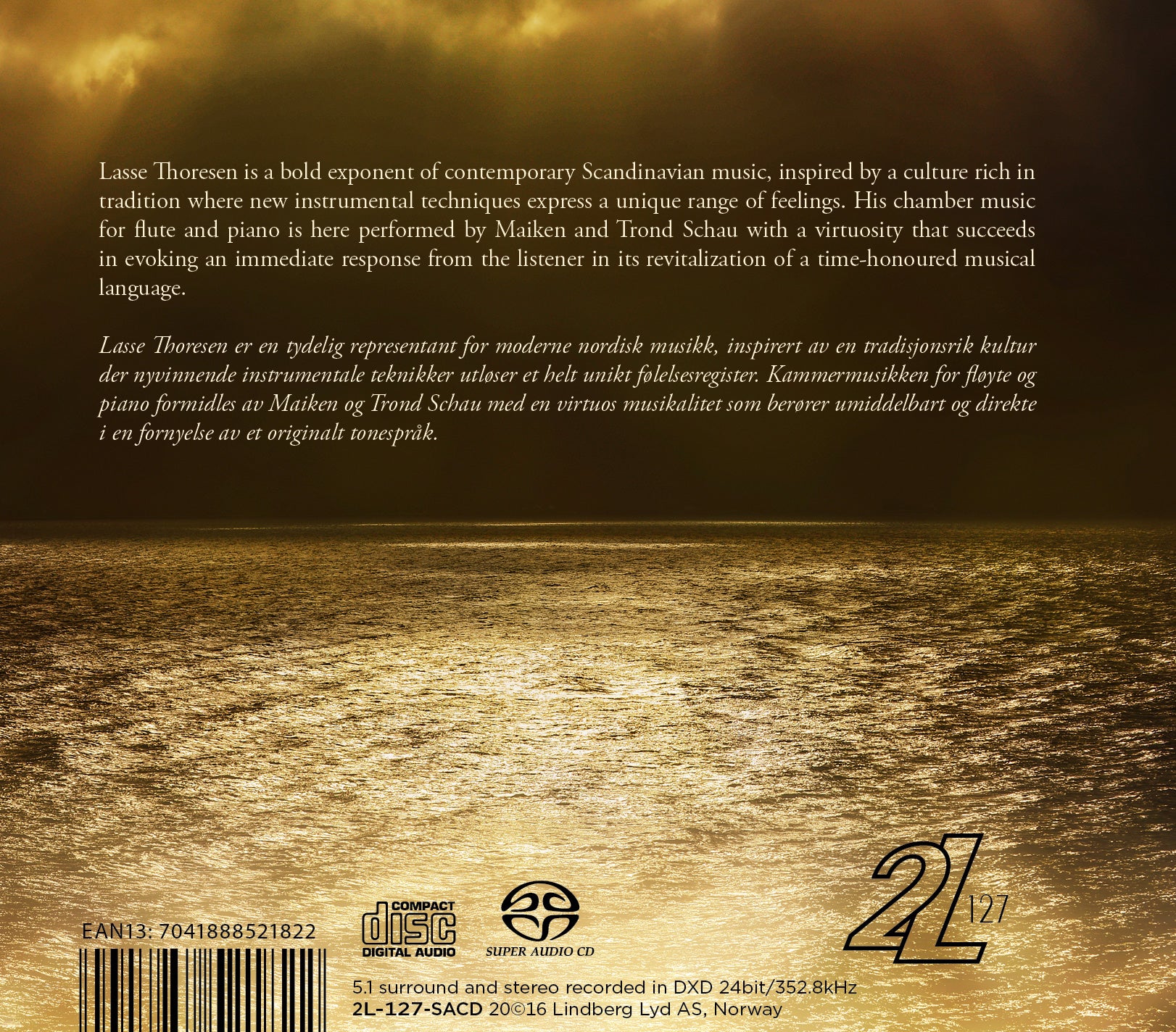 Lasse Thoresen is a bold exponent of contemporary Scandinavian music, inspired by a culture rich in tradition where new instrumental techniques express a unique range of feelings. His chamber music for flute and piano is here performed by Maiken and Trond Schau with a virtuosity that succeeds in evoking an immediate response from the listener in its revitalization of a time-honoured musical language.