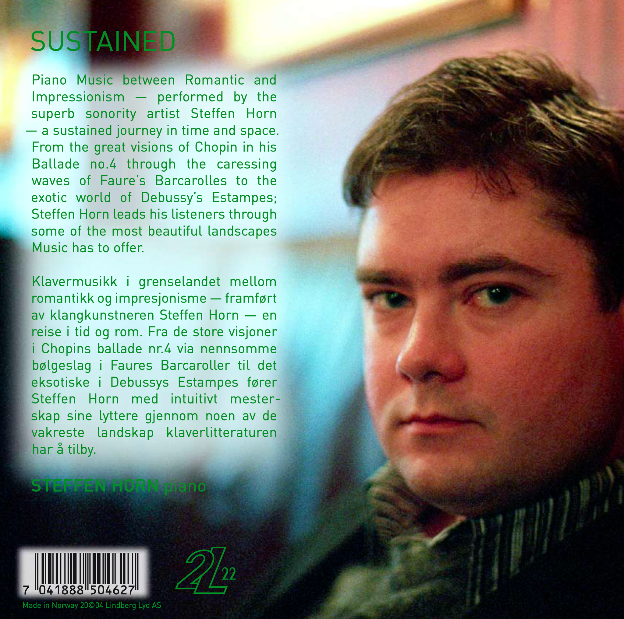 Piano Music between Romantic and Impressionism — performed by the superb sonority artist Steffen Horn — a sustained journey in time and space. From the great visions of Frédéric Chopin in his Ballade no.4 through the caressing waves of Gabriel Fauré’s Barcarolles to the exotic world of Claude Debussy’s Estampes; Steffen Horn leads his listeners through some of the most beautiful landscapes Music has to offer.
