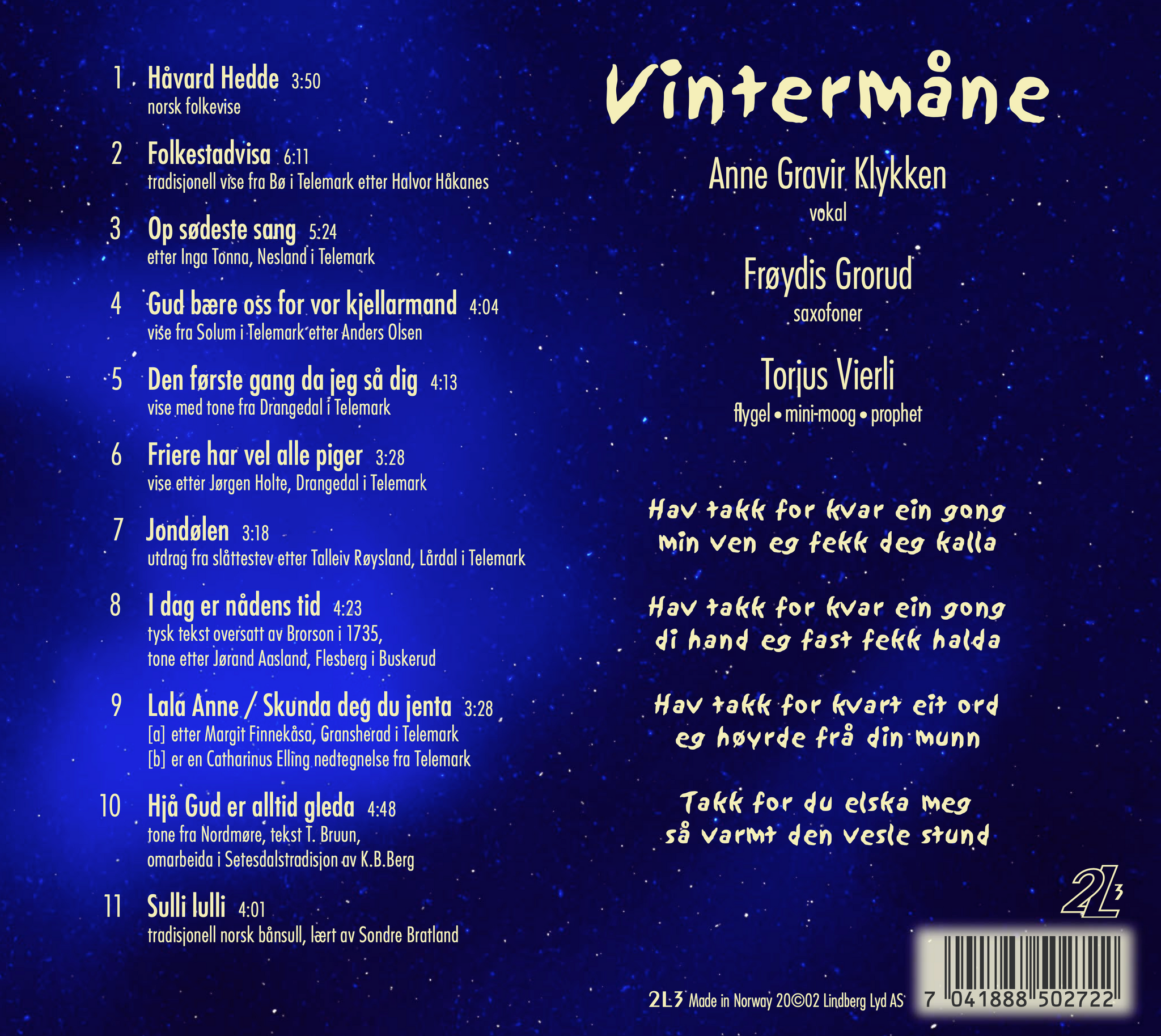 The magnificent steel blue of a Winter Moon - an eerie warm light on the cold snow. This is the inspirational background for the musicians in the young Norwegian group "Vintermåne". A fascinating landscape based on tradition and innovation is being brought to life through folk music with potent elements of jazz and pop. The specific Norwegian folk tradition of creative musical performance is here being presented to the listener in an entirely new and fertile light - and the old tunes evidently seem to prosper in their new surroundings.