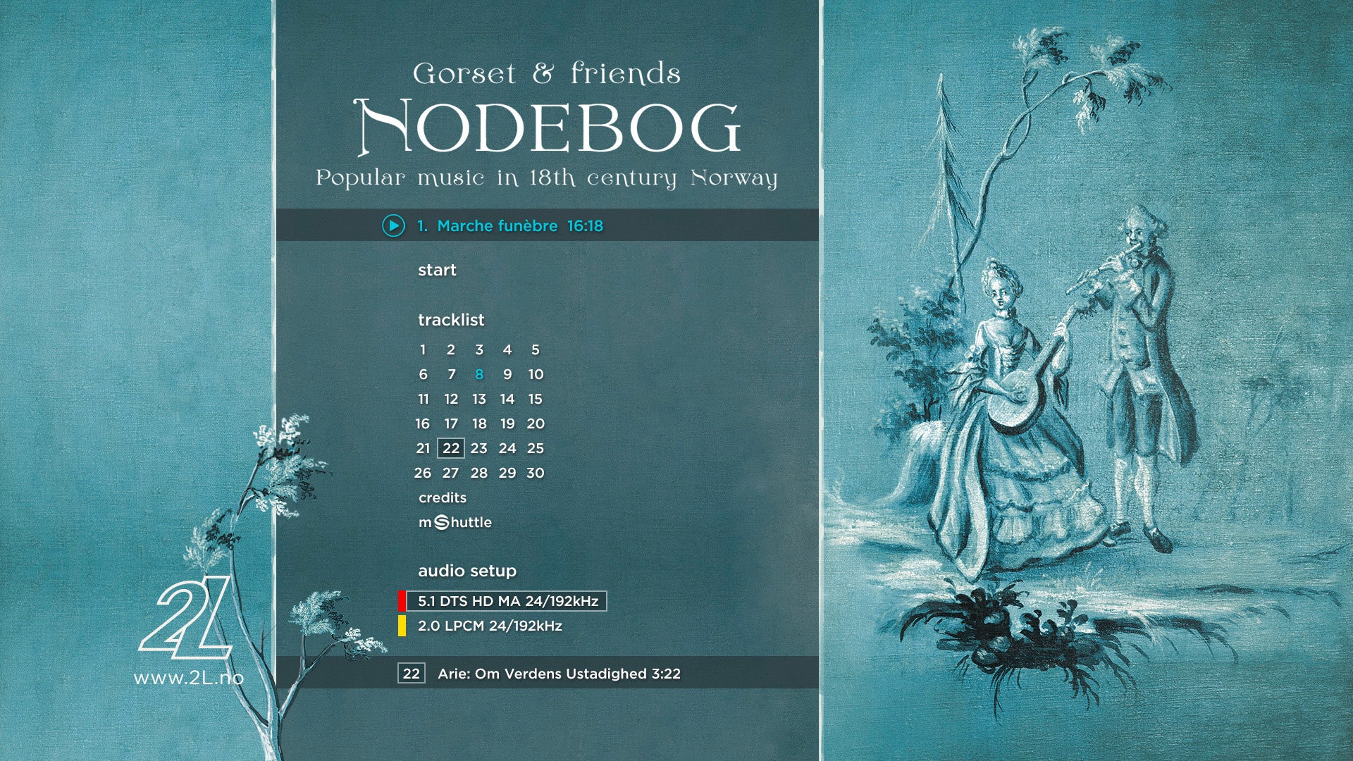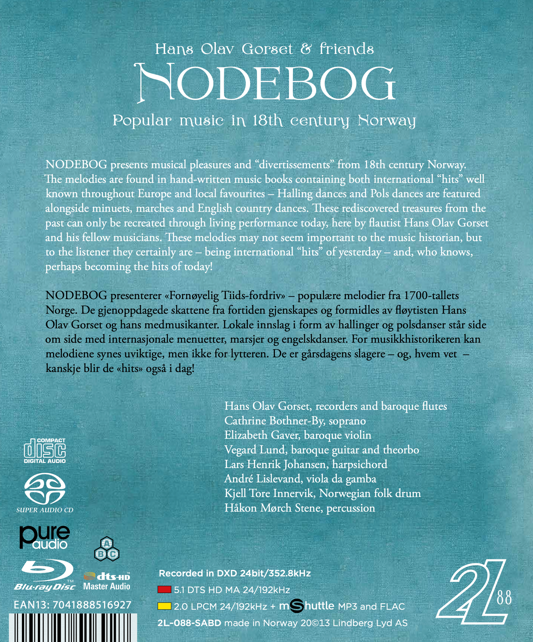 NODEBOG presents musical pleasures and "divertissements" from 18th century Norway. The melodies are found in hand-written music books containing both international "hits" well known throughout Europe and local favourites - Halling dances and Pols dances are featured alongside minuets, marches and English country dances. These rediscovered treasures from the past can only be recreated through living performance today, here by flautist Hans Olav Gorset and his fellow musicians. These melodies may not seem important to the music historian, but to the listener they certainly are - being international "hits" of yesterday - and, who knows, perhaps becoming the hits of today!