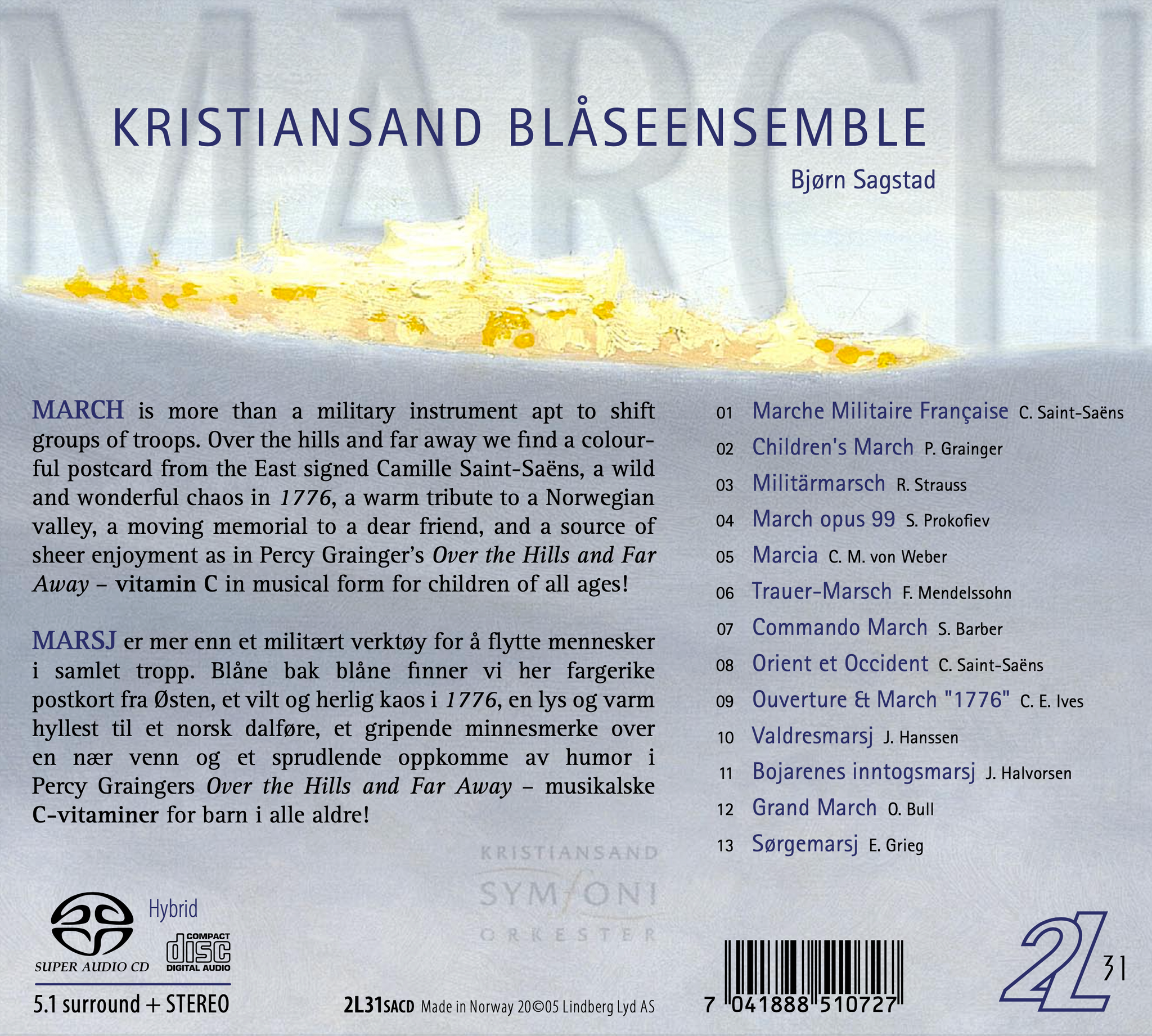 Slamrende cymbaler, hylende klarinetter og sprakende tromboner. Men en marsj kommer i så mange farger – og er ikke alltid til å marsjere etter. Med et fargerikt postkort fra Østen, Orient et Occident, signert Camille Saint-Saëns – vilt og herlig kaos i Charles Ives’ 1776 – en lys og varm hyllest til et norsk dalføre med Hanssens Valdresmarsj – et gripende minnesmerke over en nær venn i Edvard Griegs Sørgemarsj – et sprudlende oppkomme av humør som Percy Graingers Over the Hills and Far Away, er dette musikalske C-vitaminer for barn i alle aldre!